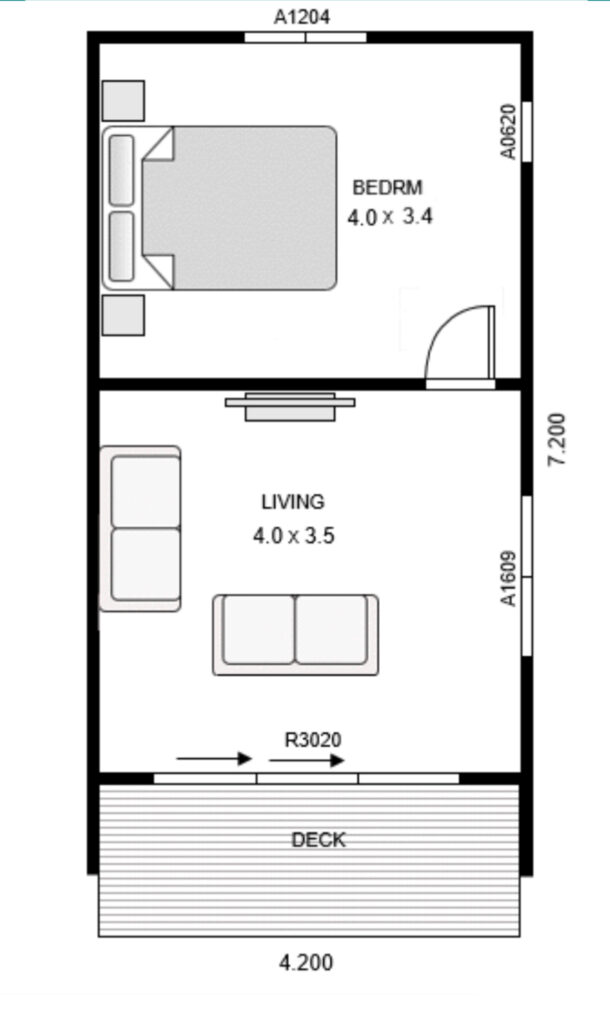 A separate 4.0 x 3.4m bedroom offers privacy and comfort, making this design ideal as a self-contained sleepout, rental unit, or secondary dwelling.